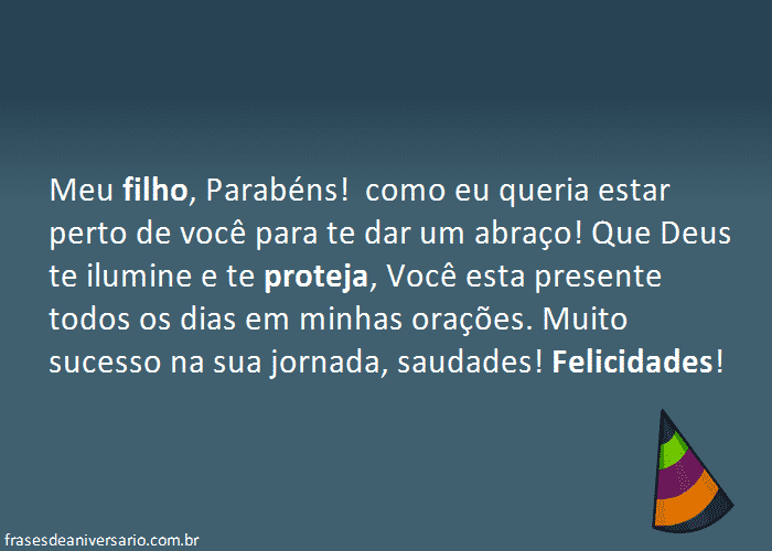 Você é o filho que todo pai e mãe gostaria de ter, e hoje está de parabéns. O meu primeiro filho, e o grande amor da minha vida. Meu desejo é que esta sua data fique eternamente gravada na sua memória, e que seja pelas melhores razões.